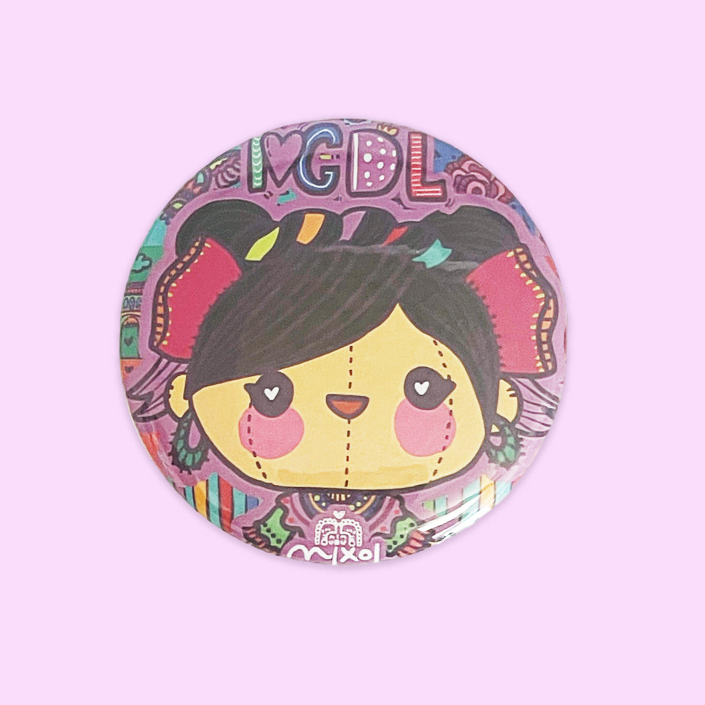 Pequeño espejo botón metálico con diámetro de 6 cm.