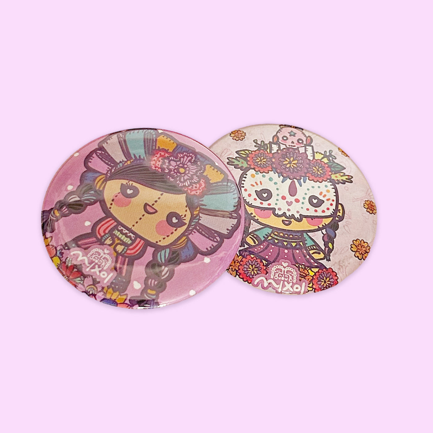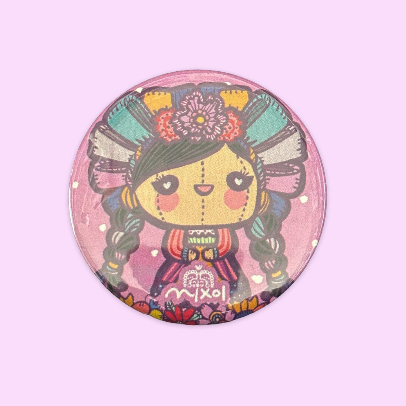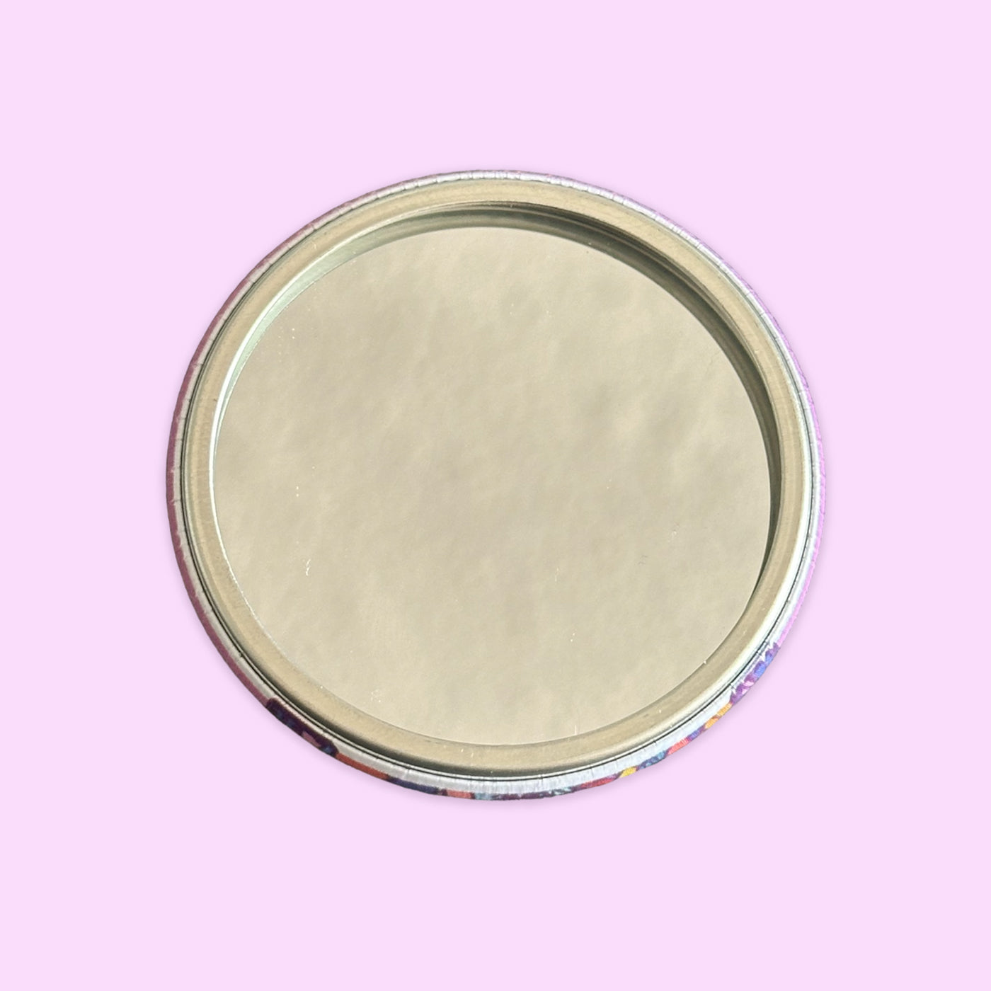 Pequeño espejo botón metálico con diámetro de 6 cm.