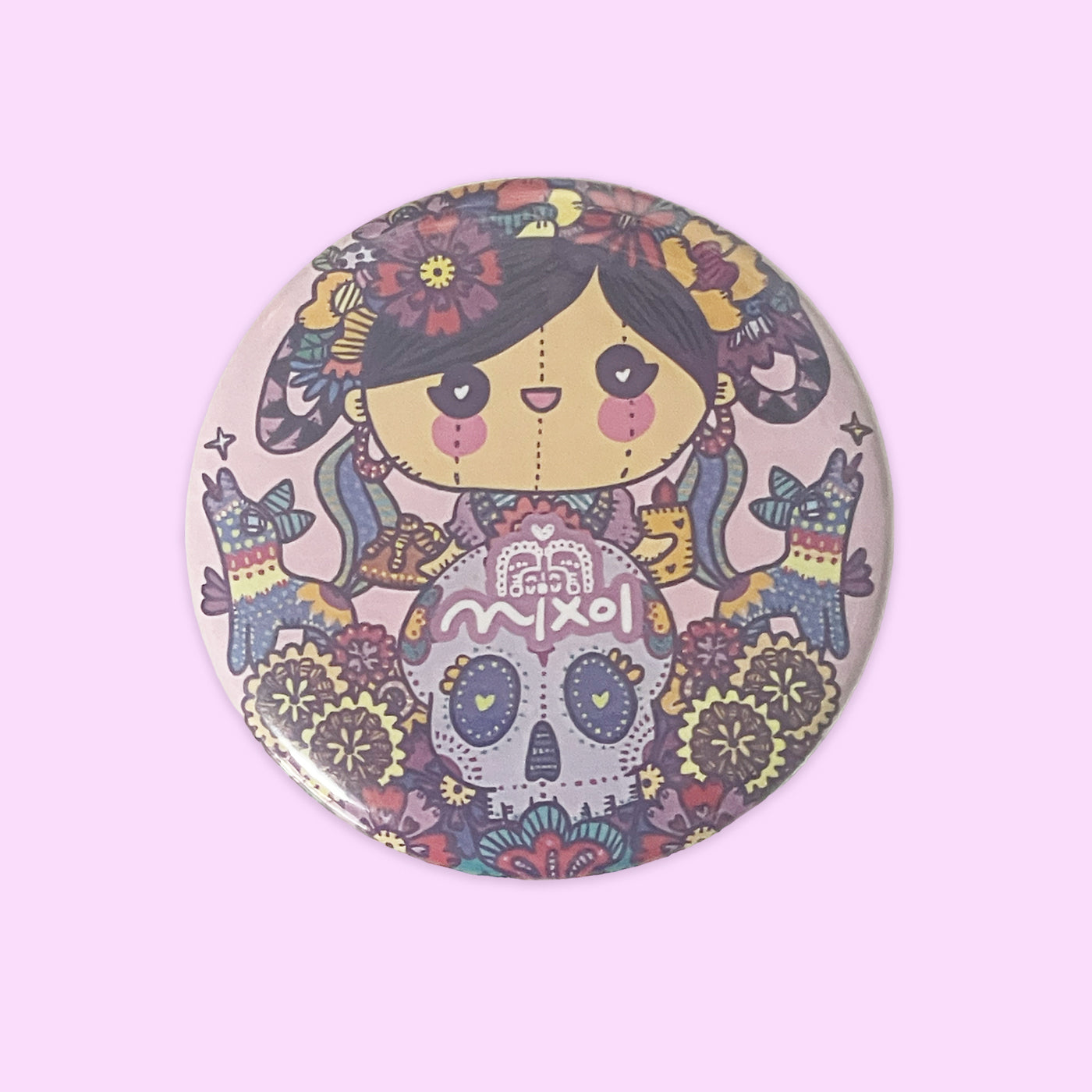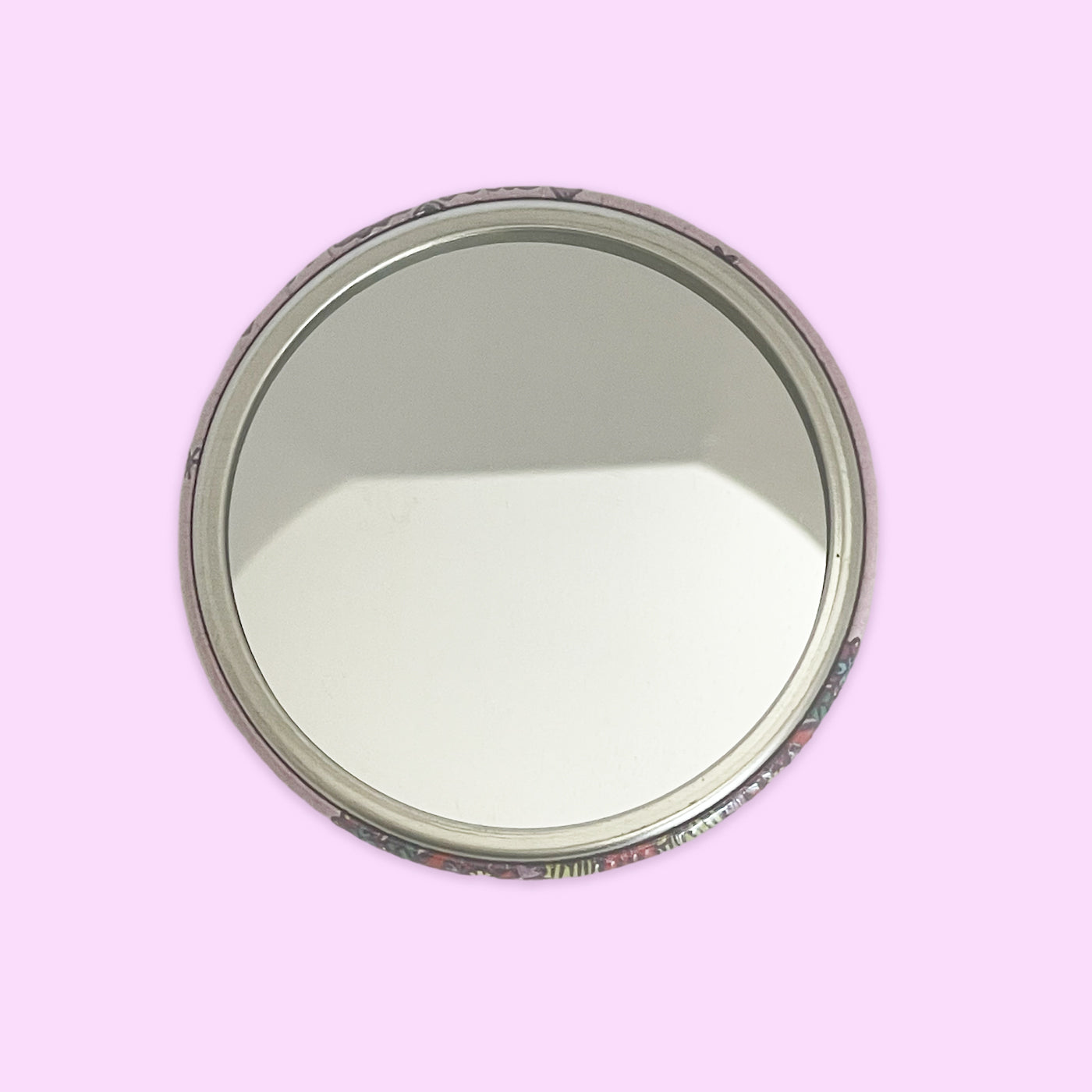 Pequeño espejo botón metálico con diámetro de 6 cm.