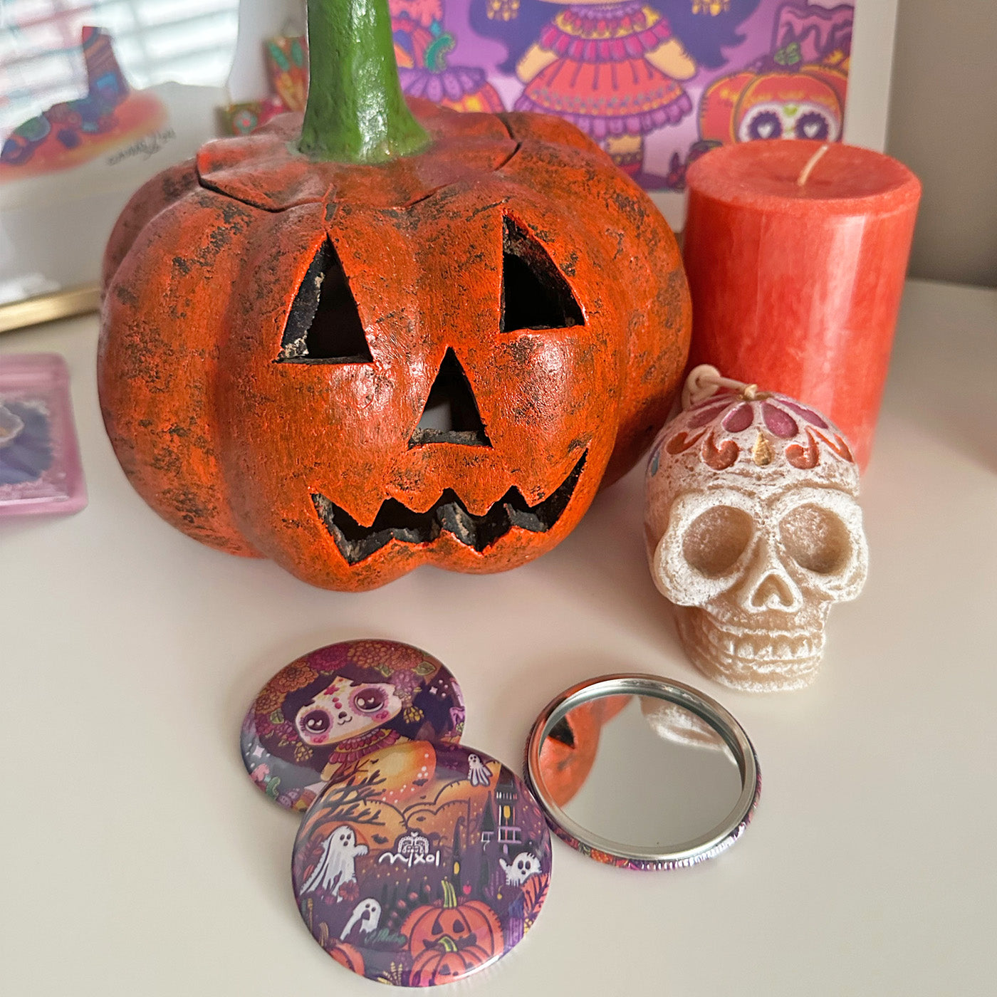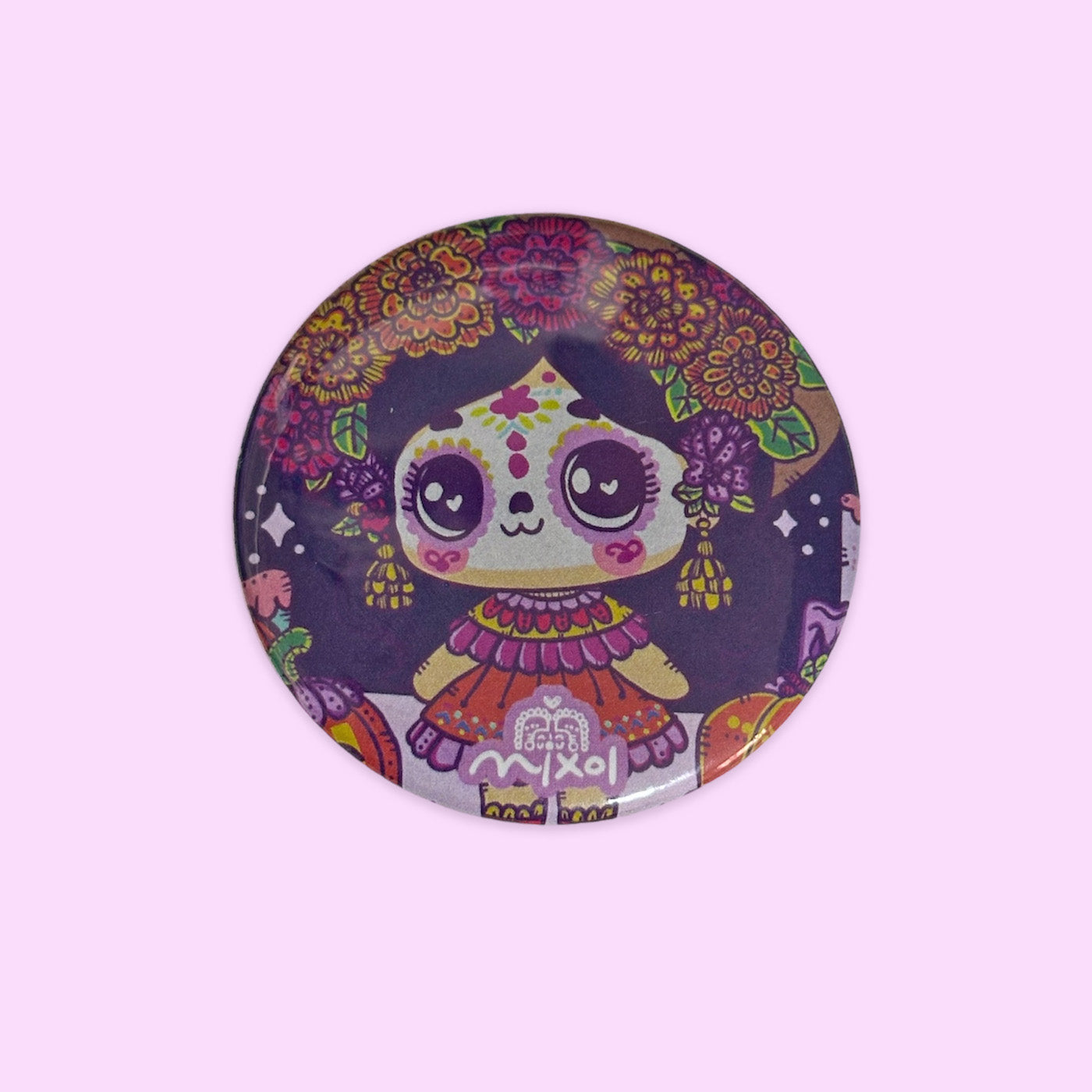 Pequeño espejo botón metálico con diámetro de 6 cm.
