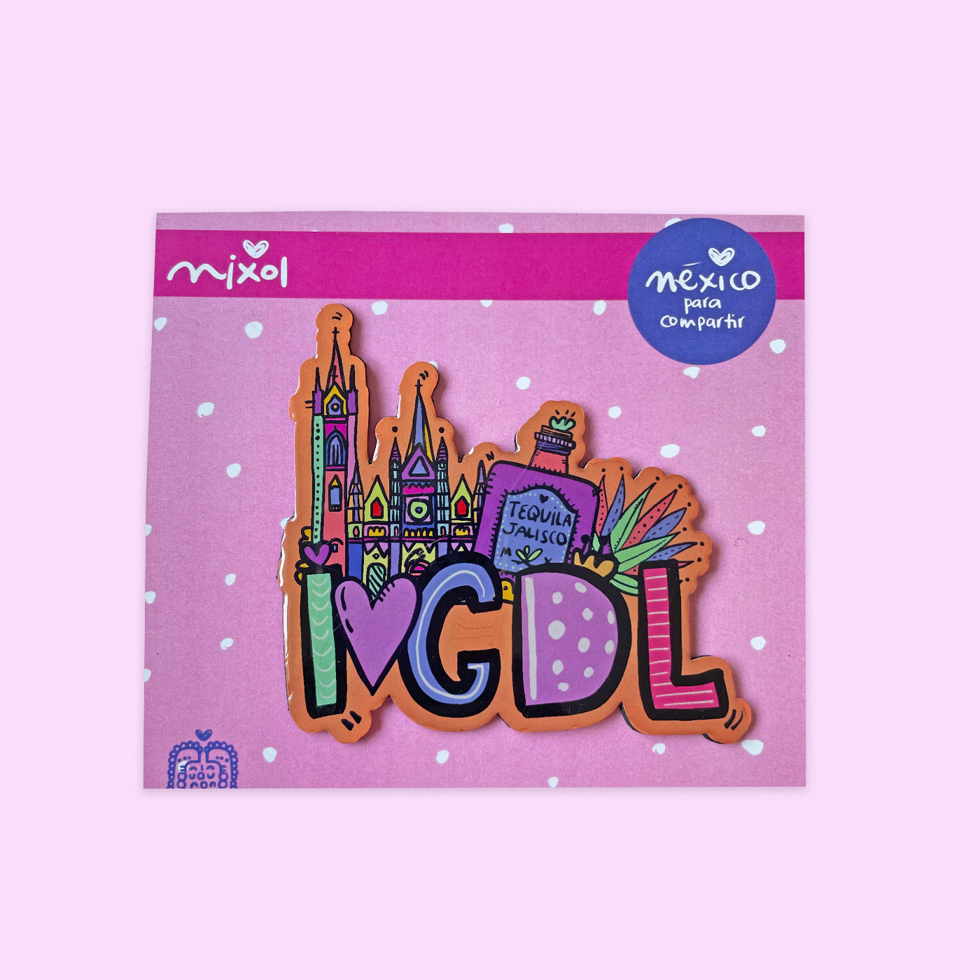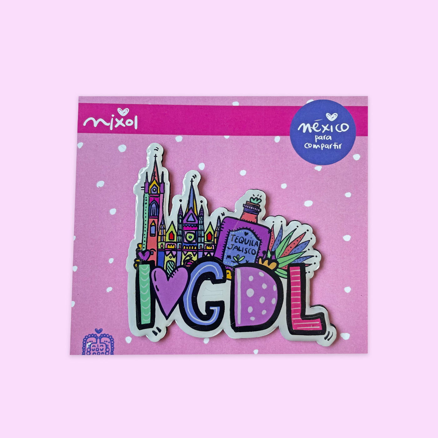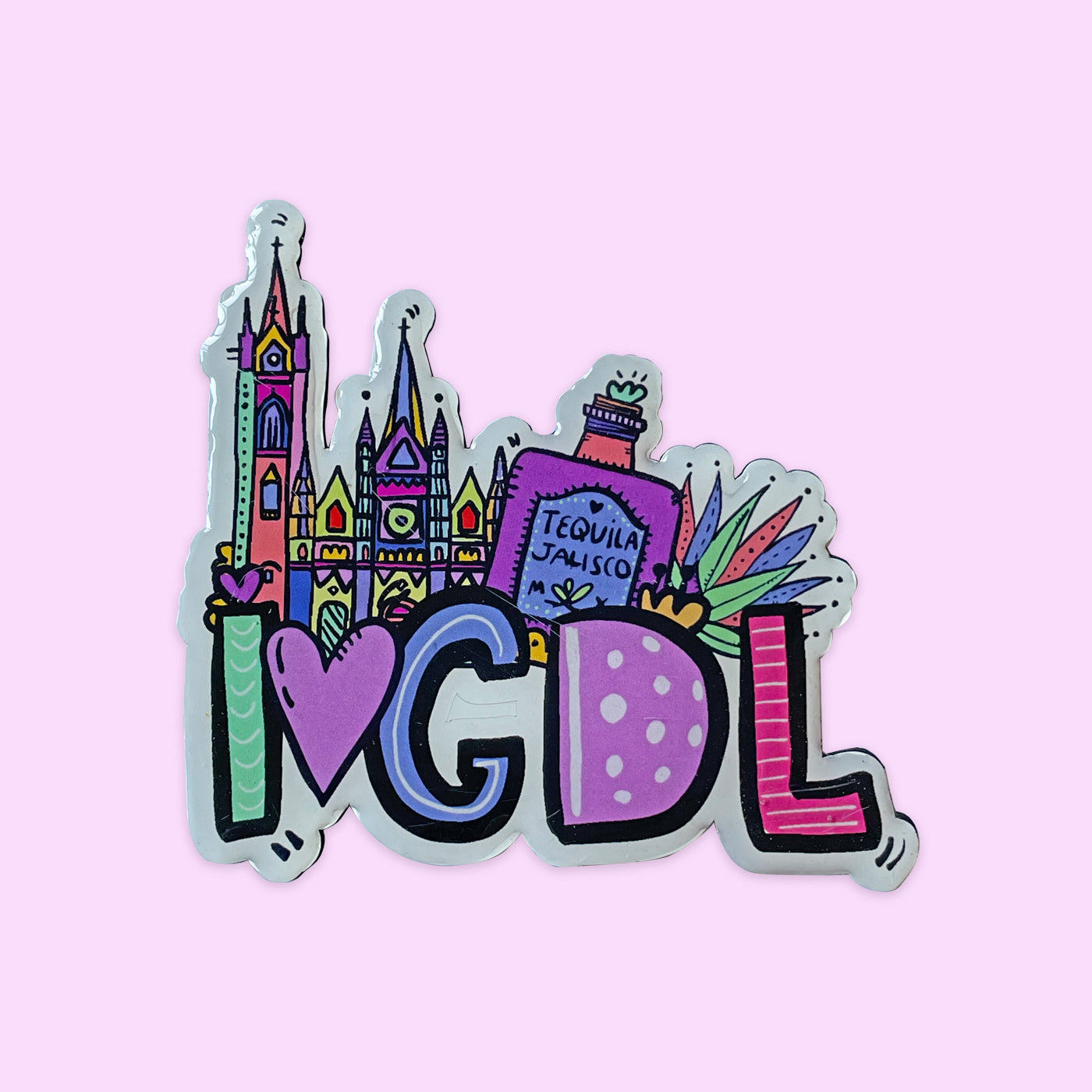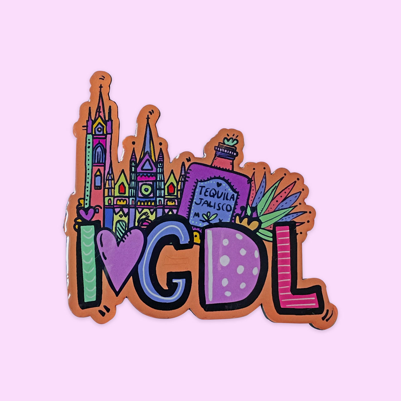 Imán de I love GDL con tequila, agave y Expiatorio con cubierta plastificada.