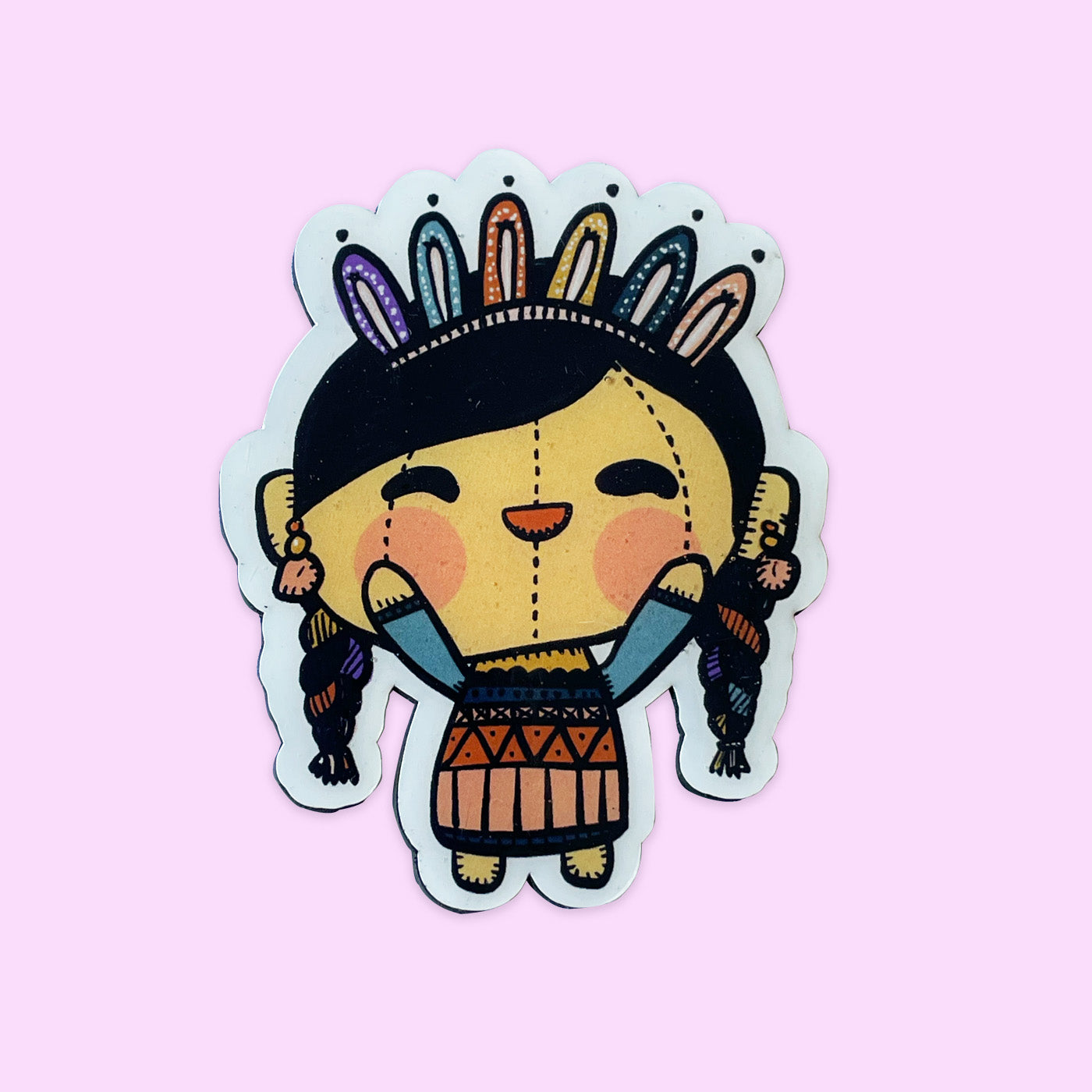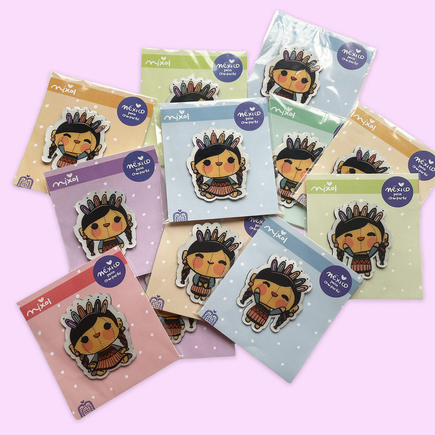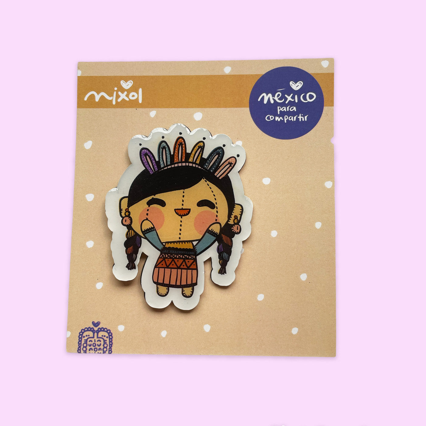 Imán edición especial de la muñeca María con brazos abiertos y cubierta plastificada.