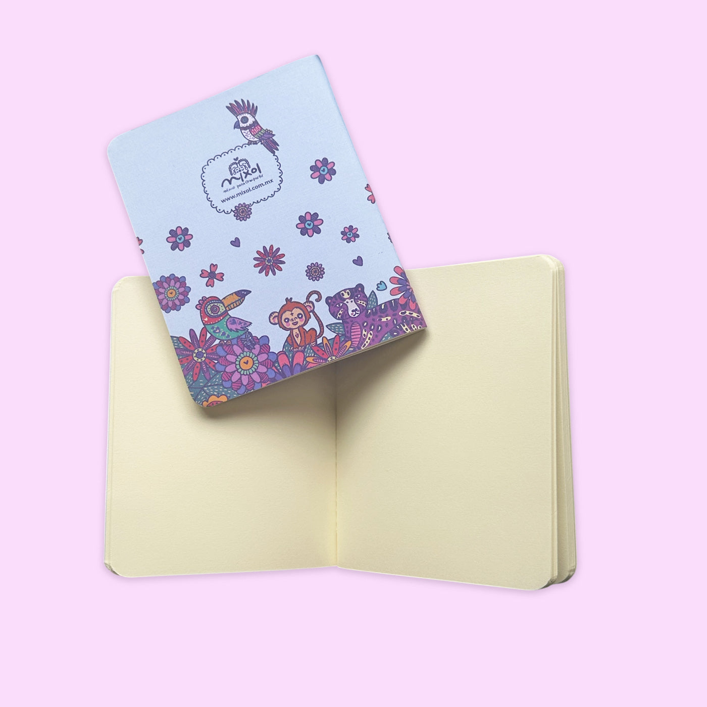 Libreta tamaño pocket de 11 x 13 cm, cosidas con pasta texturizada blanda.