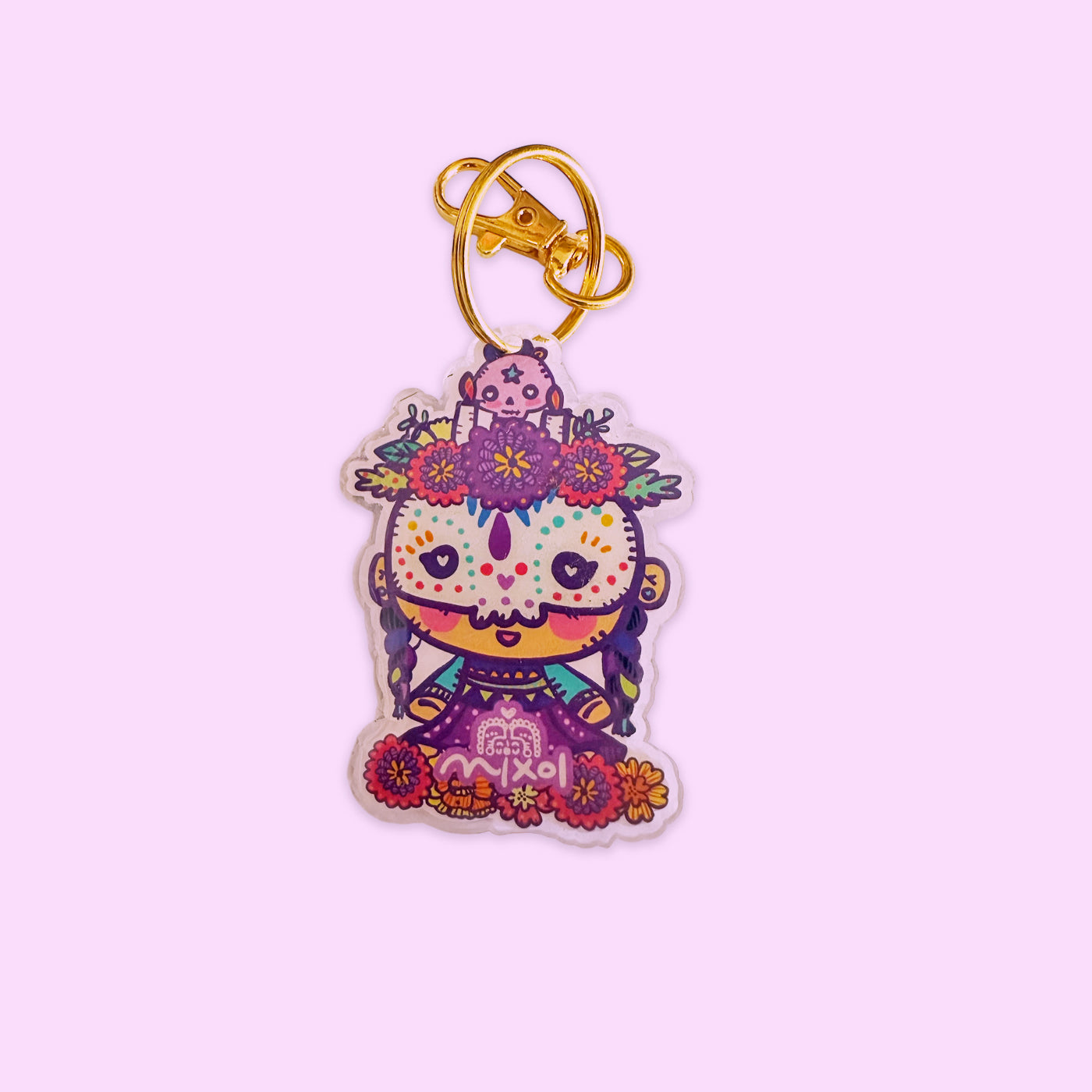 Llavero de acrílico transparente con resina de Día de Muertos doble vista.