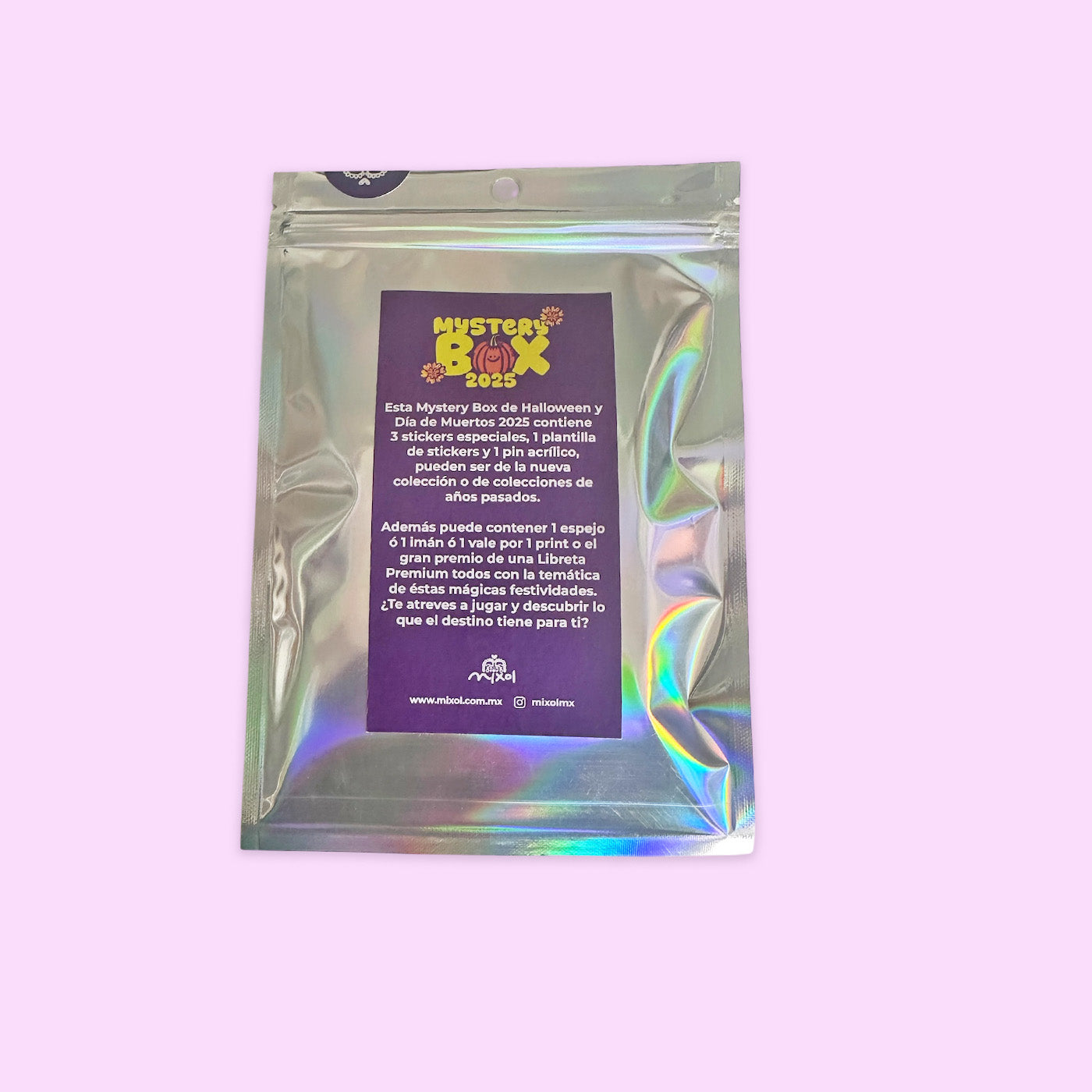 Esta Mystery Box de Halloween y Día de Muertos 2025 contiene 3 stickers especiales, 1 plantilla de stickers y 1 pin acrílico, pueden ser de la nueva colección o de colecciones de años pasados.