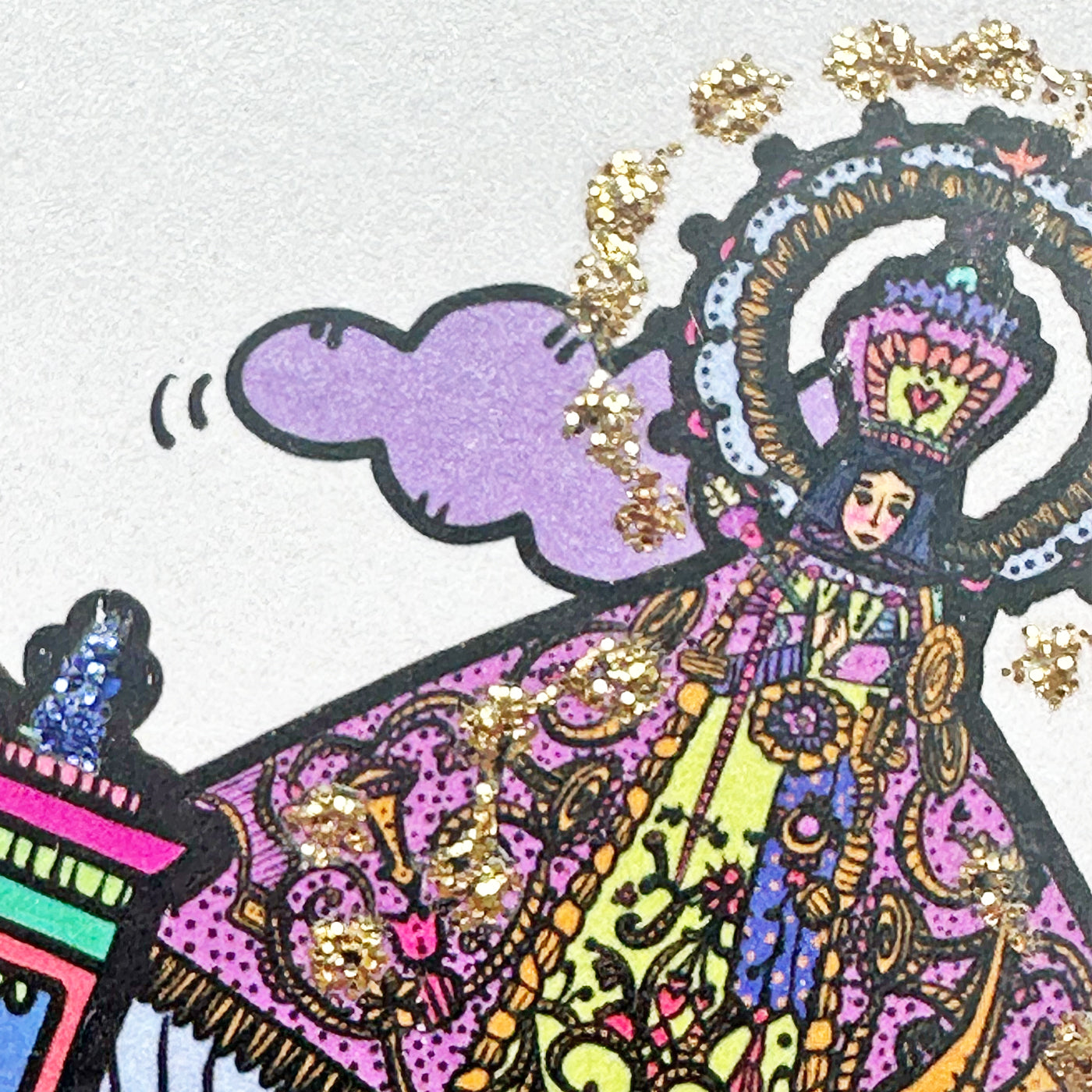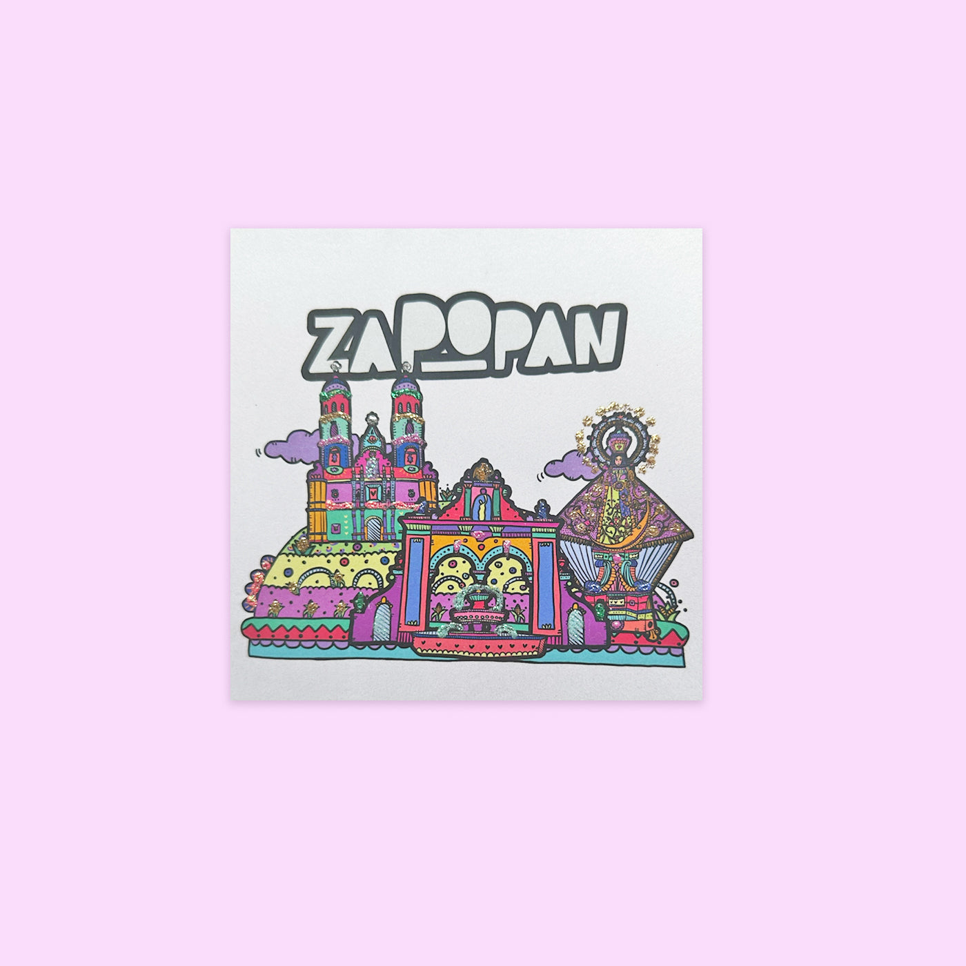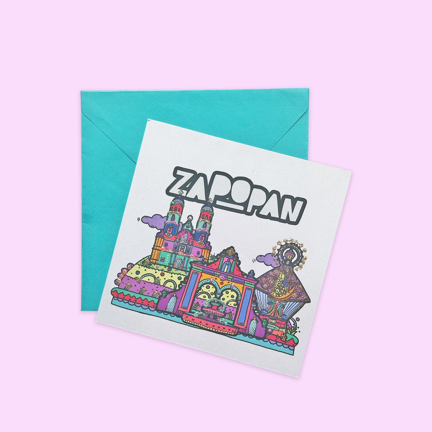 Decorada con glitter, incluye sobre de color.